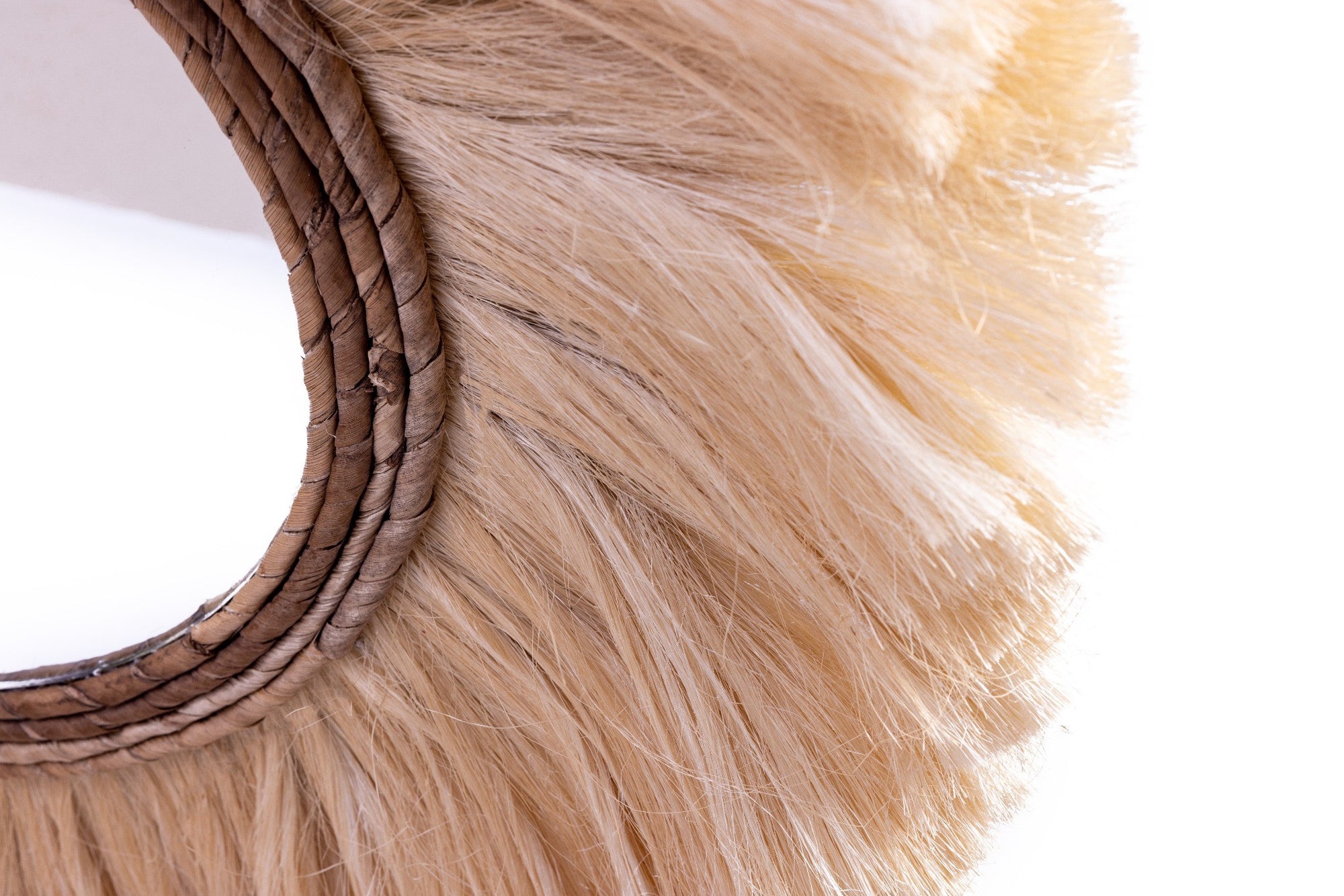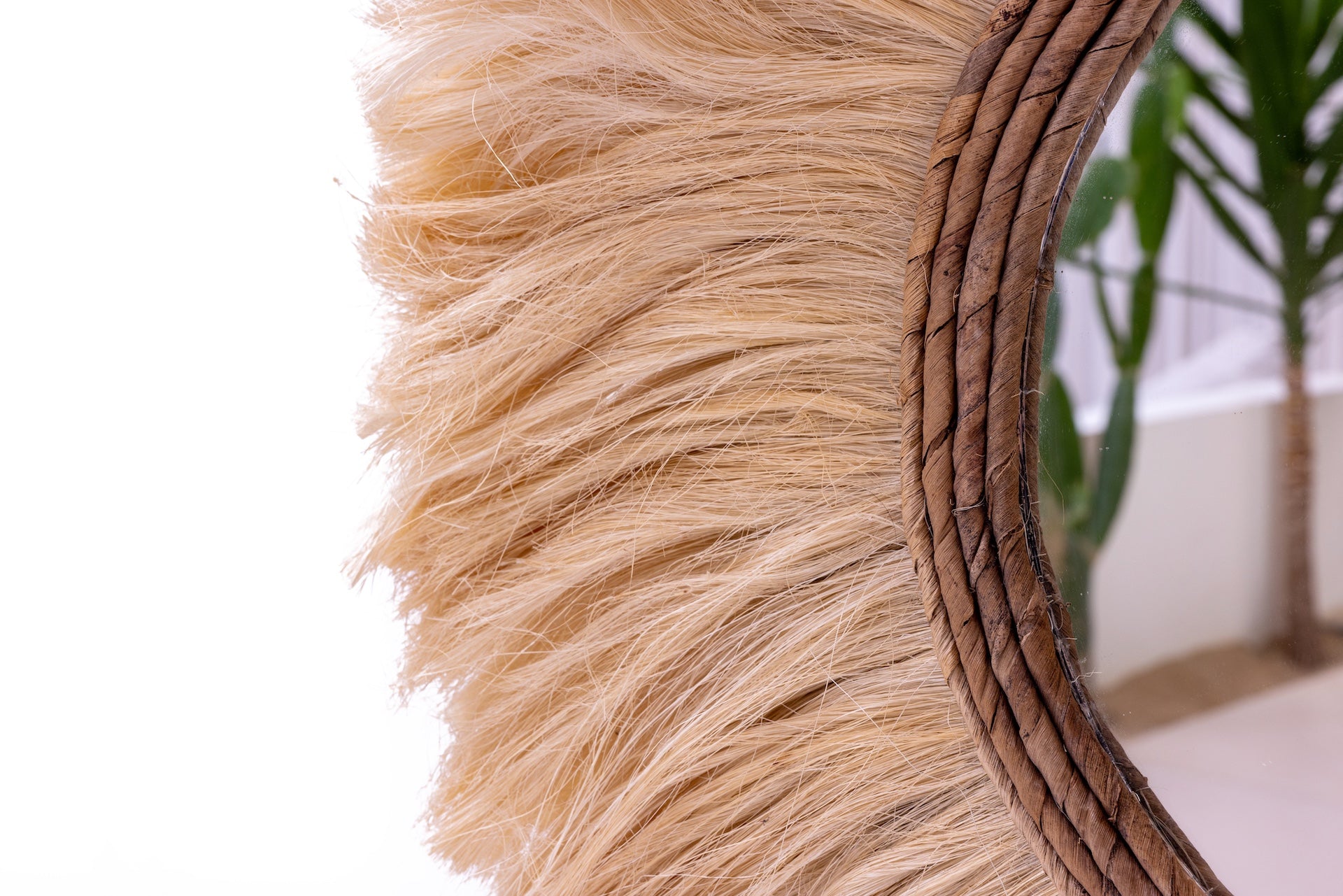 Die Kombination aus Ananas-Fasern und Rattan verleiht dem Boho Spiegel eine dezente Textur. Kleine Einzigartigkeiten im Material machen jedes Stück besonders, ohne aufdringlich zu wirken.