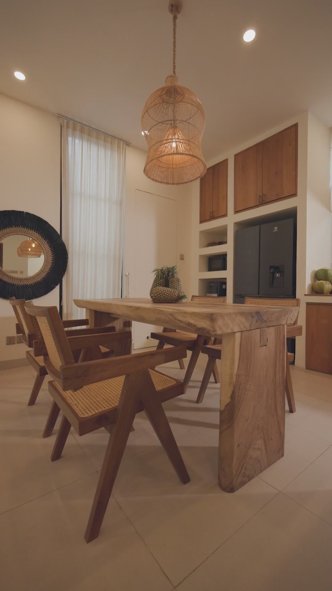 Der Rattanstuhl eignet sich gleichermaßen für das Esszimmer, den offenen Wohnraum oder auch einen geschützten Outdoor-Bereich. Er fügt sich nahtlos in jede Umgebung ein und verleiht jedem Bereich eine einladende Atmosphäre.