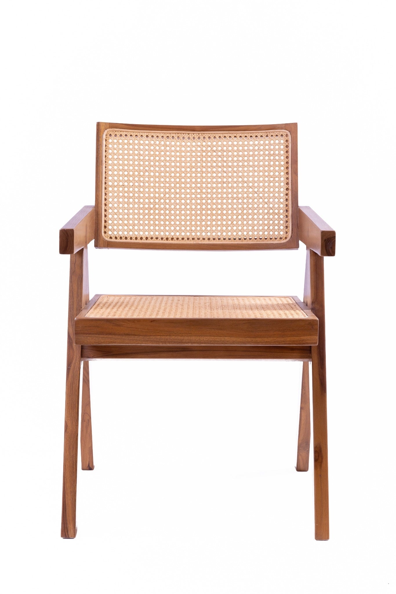Rahmen und Armlehnen werden aus massivem Teakholz gefertigt, ergänzt durch ein fein gearbeitetes Rattangeflecht in Sitzfläche und Rückenlehne. Diese Kombination verleiht dem Boho-Stuhl nicht nur seine besondere Optik, sondern macht ihn auch robust und dauerhaft formstabil.